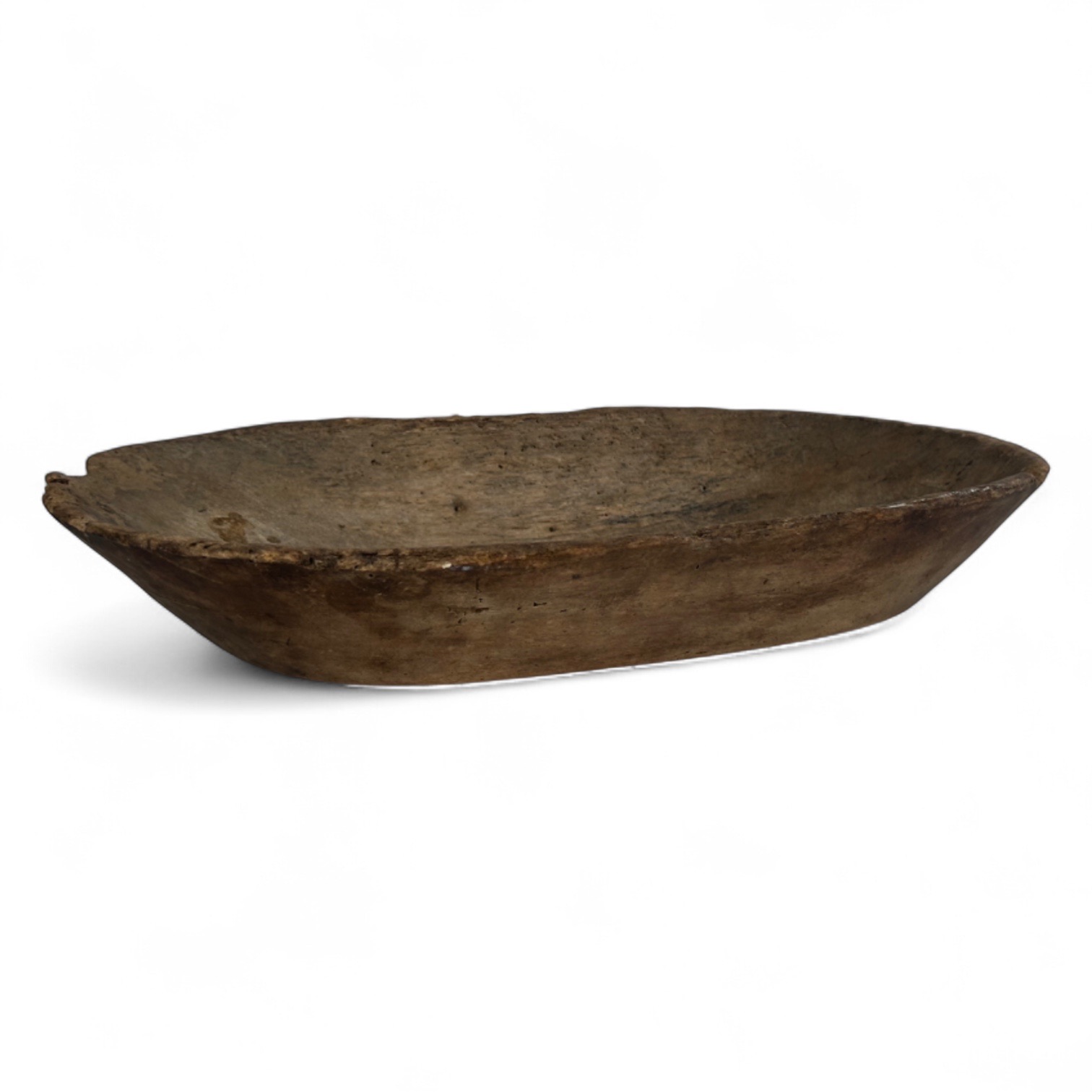Hand-carved antique dough bowl with organic form and visible tool marks. Measures 18.5″D x 10.25″W x 3″H.