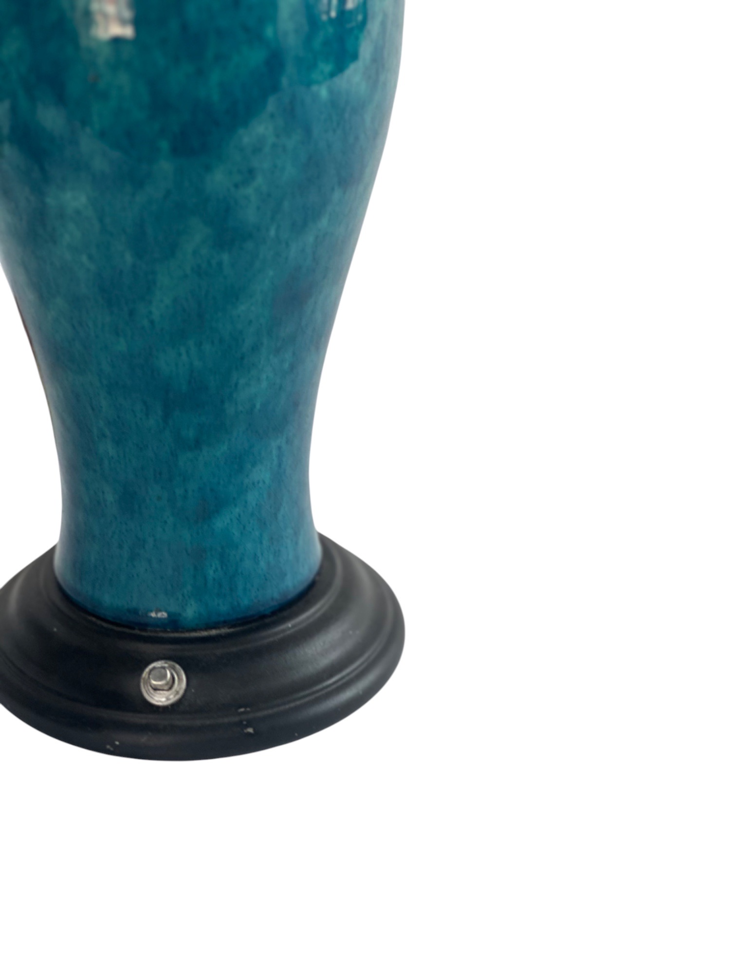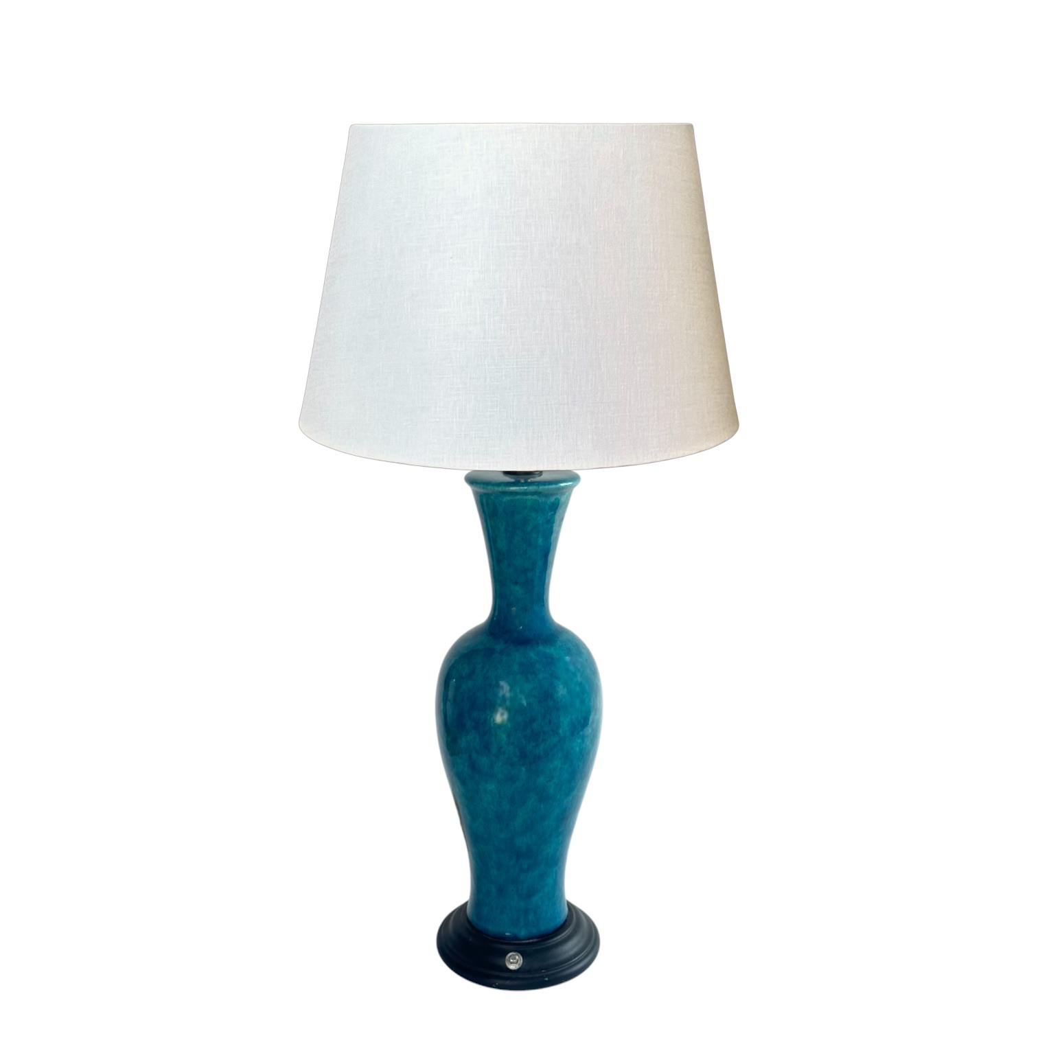 Vibrant blue lamp with a slender profile and neutral shade, measuring 5″ diameter by 15″ high. Compact size ideal for tabletop or accent use.