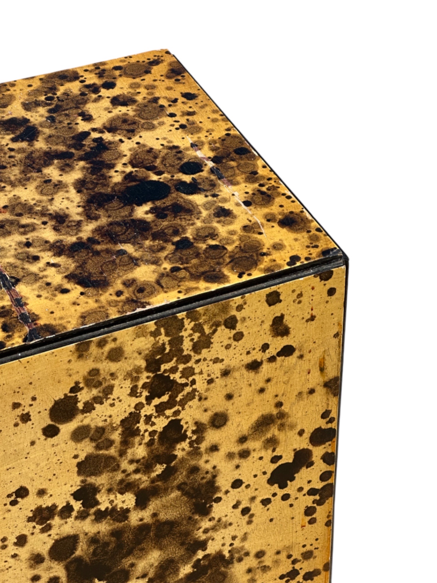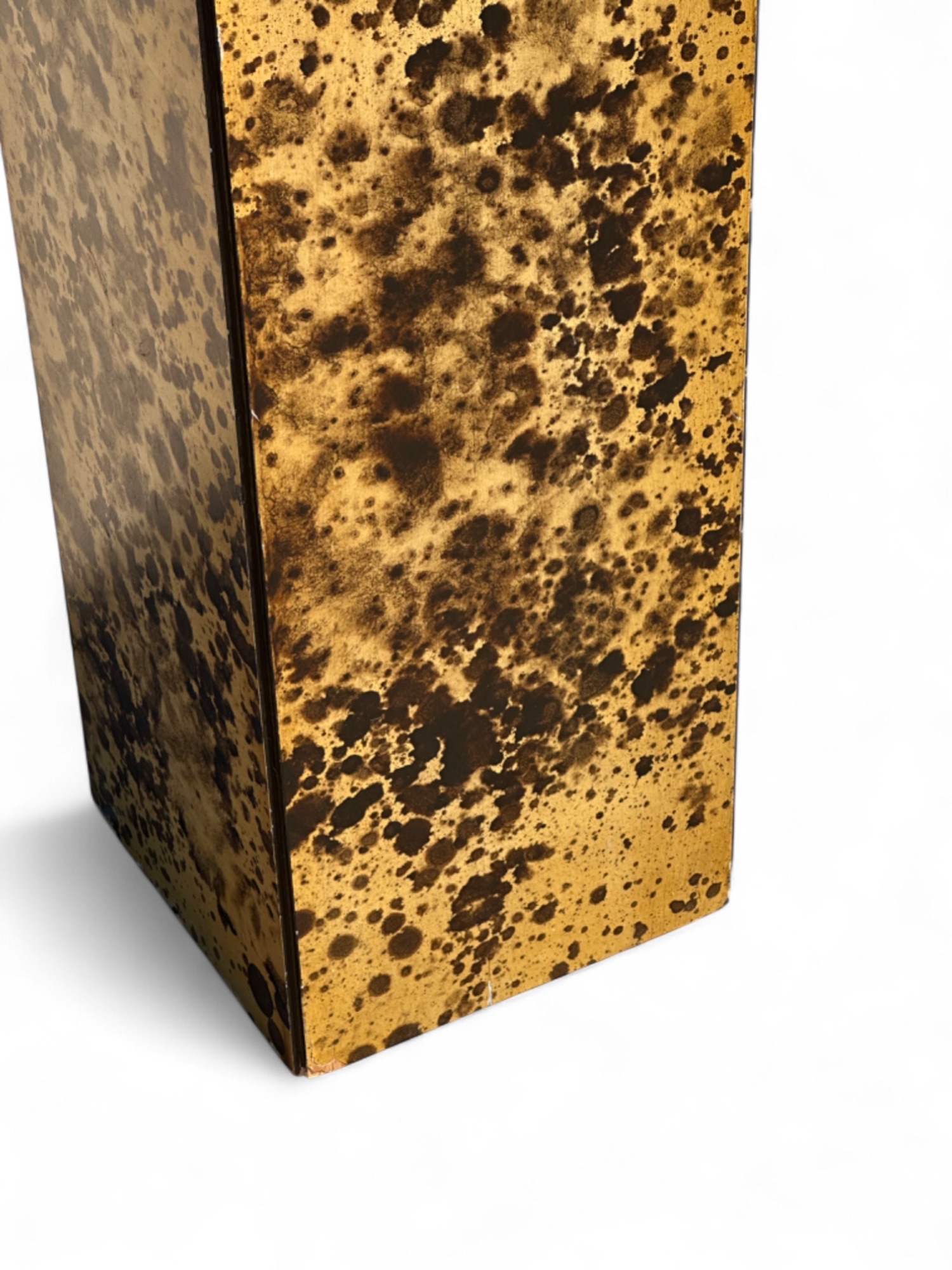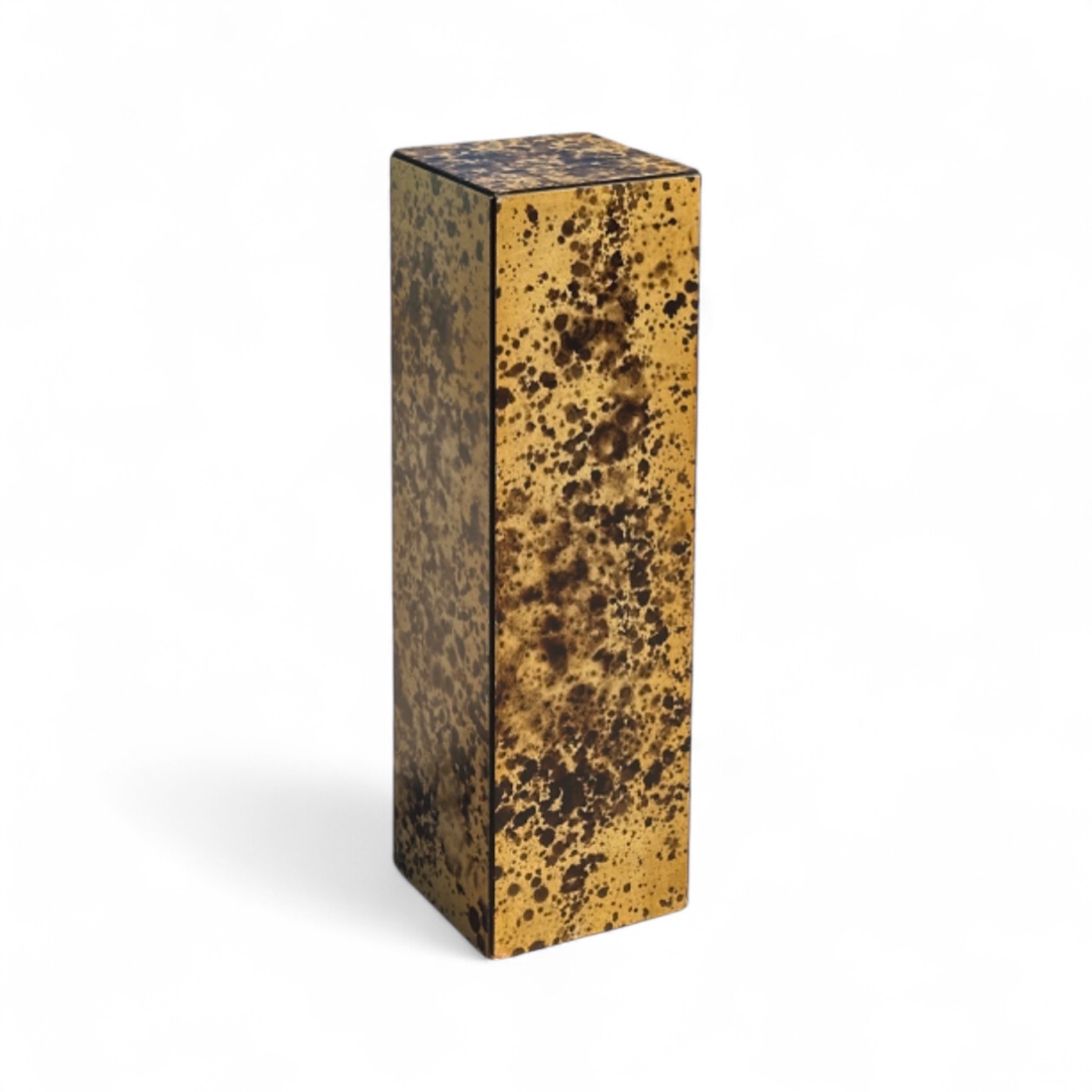 Square pedestal with faux-tortoiseshell surface, suitable for sculpture display or use as a plant stand. Measures 12″ W x 12″ D x 40″ H.