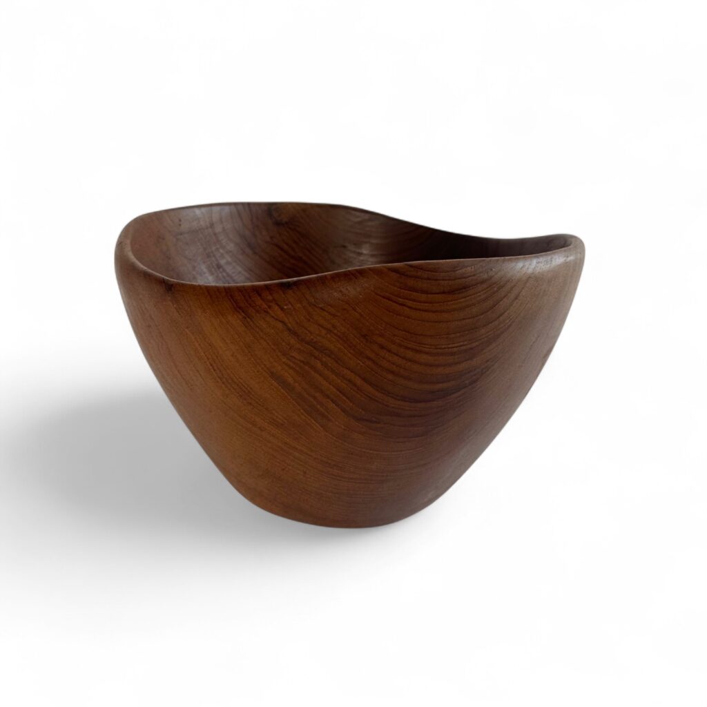 Hand-turned teak bowl with undulating rim. Measures 11.5″ in diameter and 8″ in height.