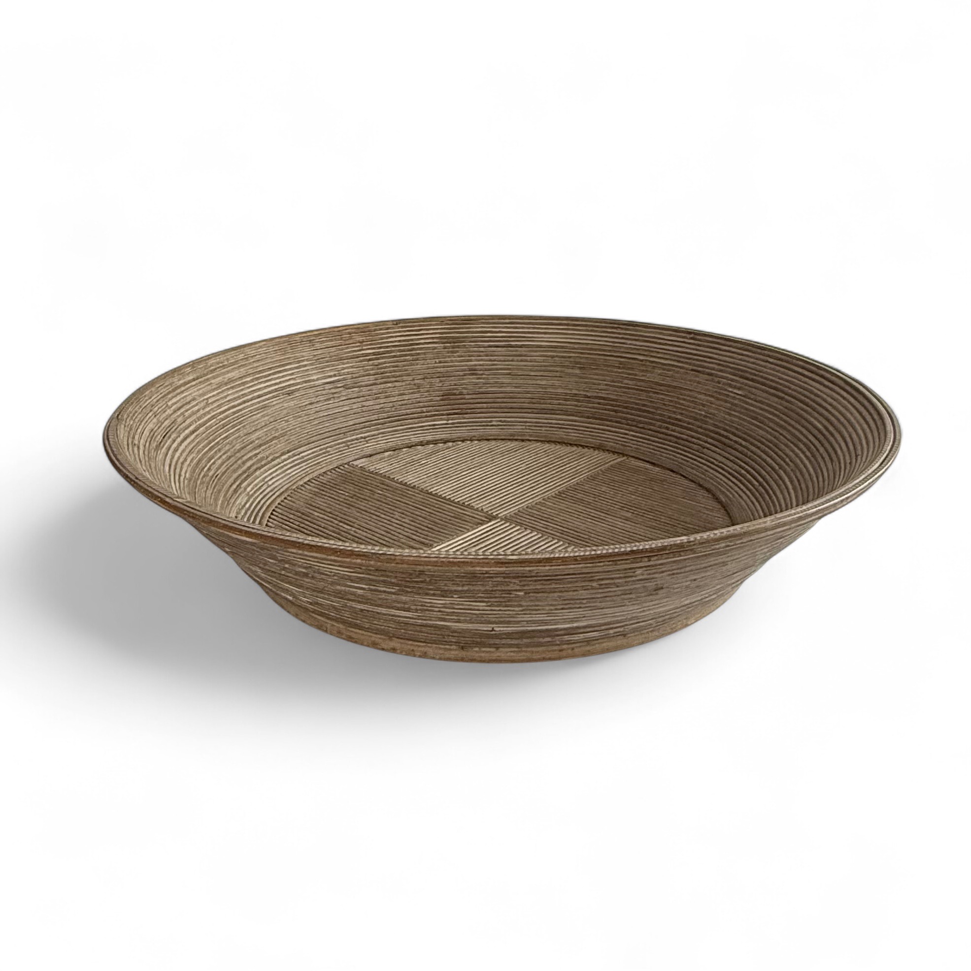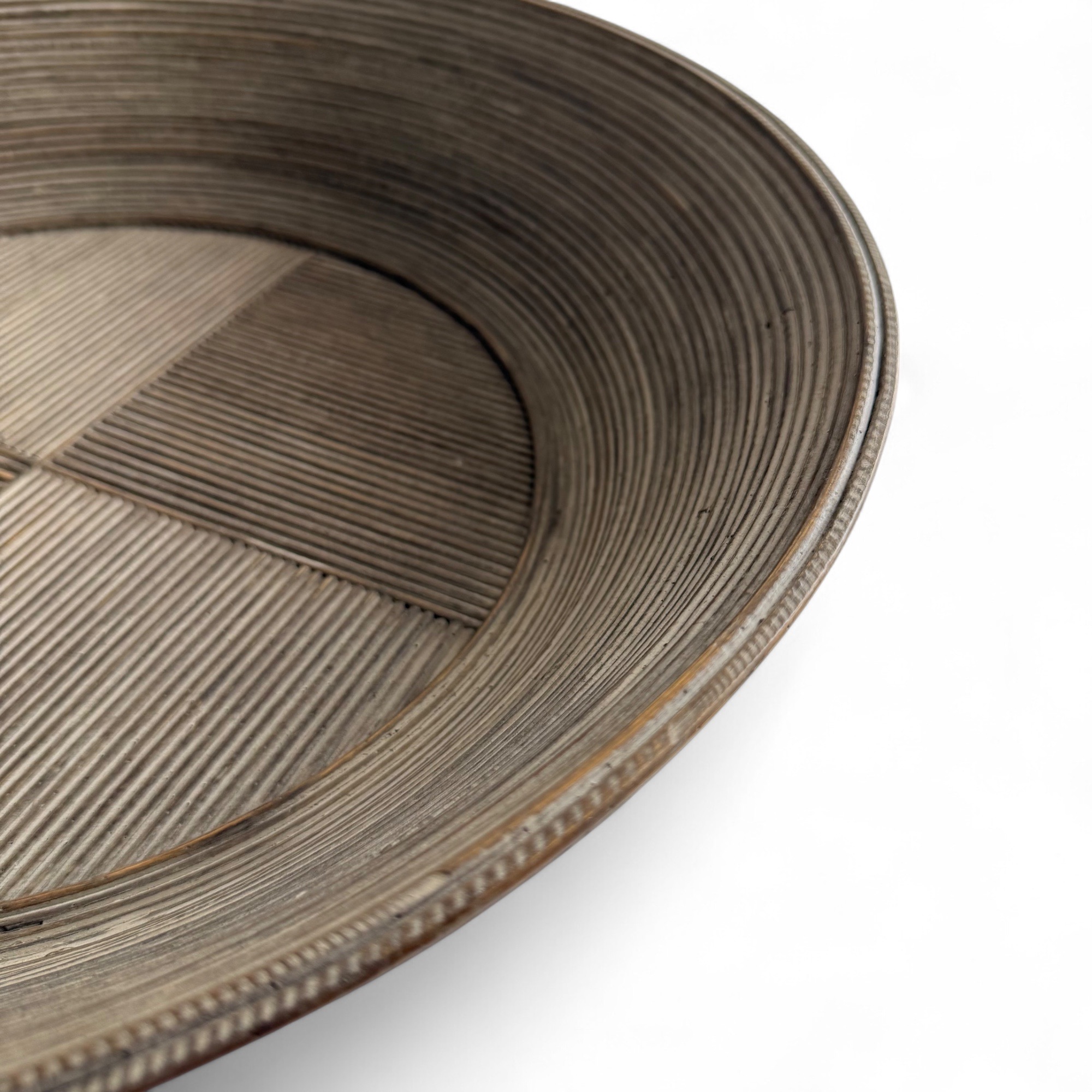 Wide and shallow carved wood basket with a subtle geometric pattern on the interior. Ideal as a decorative centerpiece or functional display tray for fruit, textiles, or other dry items.