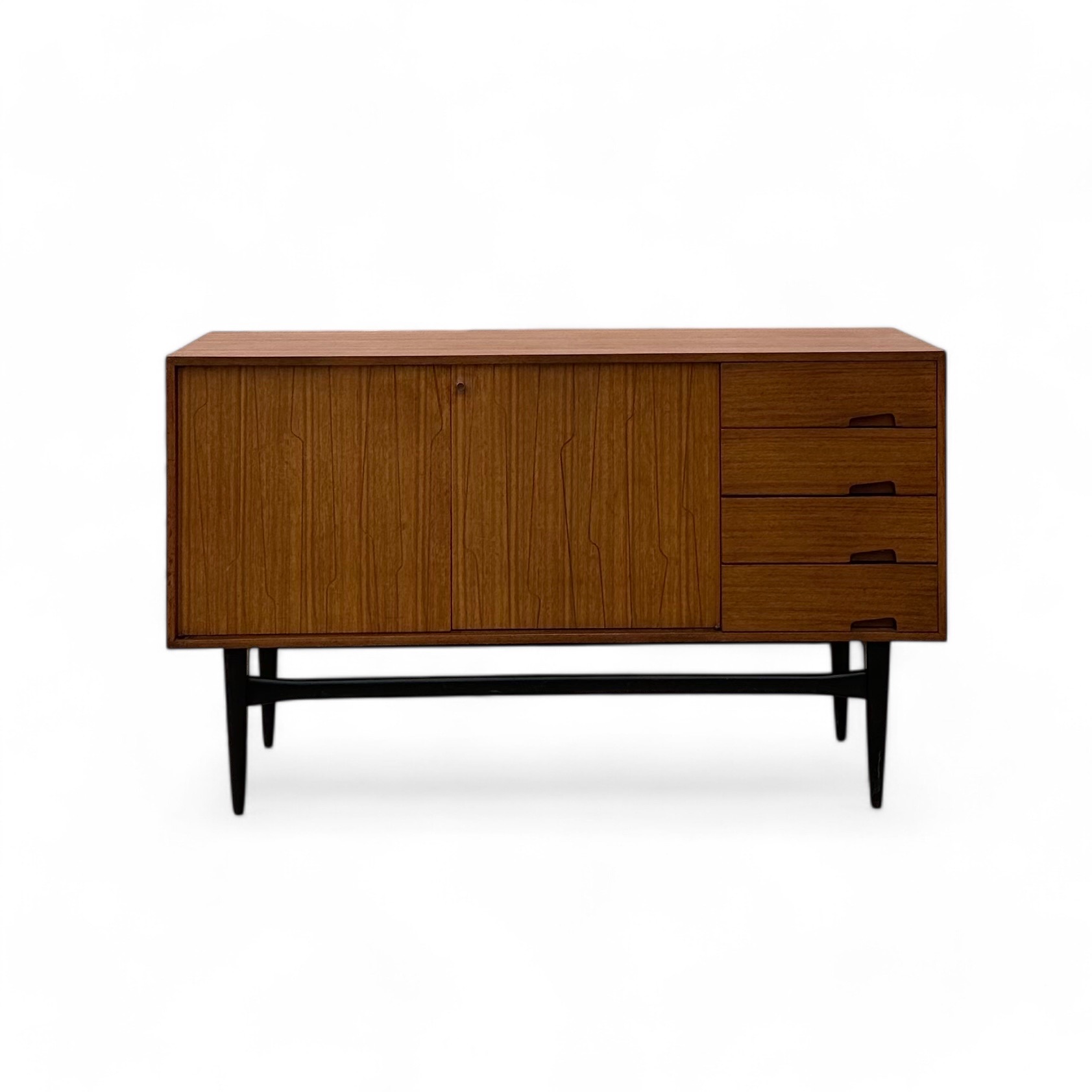 A mid-century modern sideboard by Wrighton, featuring a sleek, minimalist design with ample storage. Crafted with clean lines and a warm wood finish, this piece is both functional and stylish. Measures 54 inches in width, 18 inches in depth, and 32.25 inches in height.