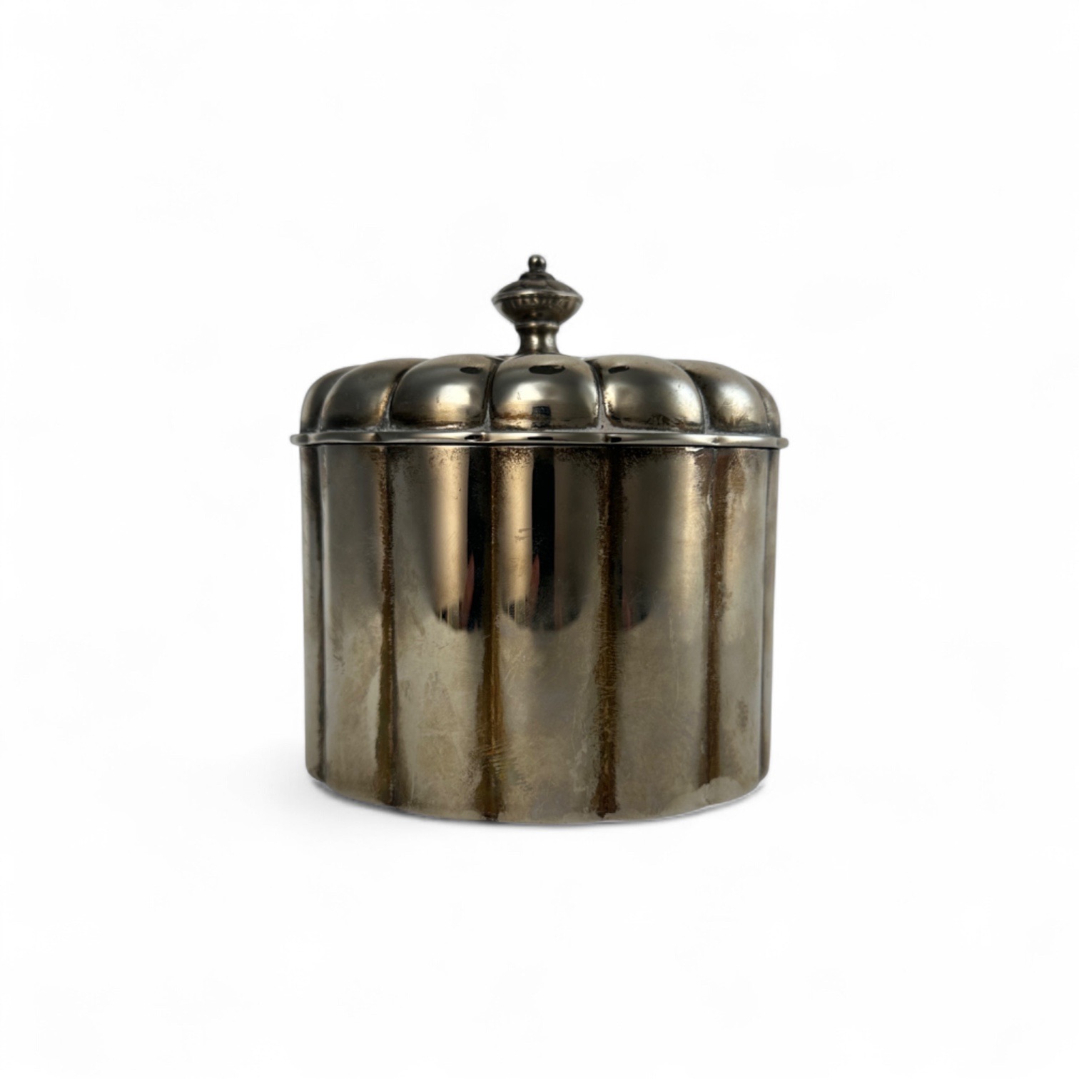 Lidded silver-plated box with ribbed body and finial handle. Measures 5″W x 4″D x 5″H.