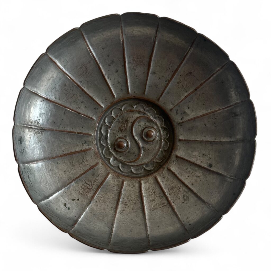 Ribbed copper bowl with a silvery finish and yin yang symbol at center. Measures 12.5″ in diameter and 3″ in height.
