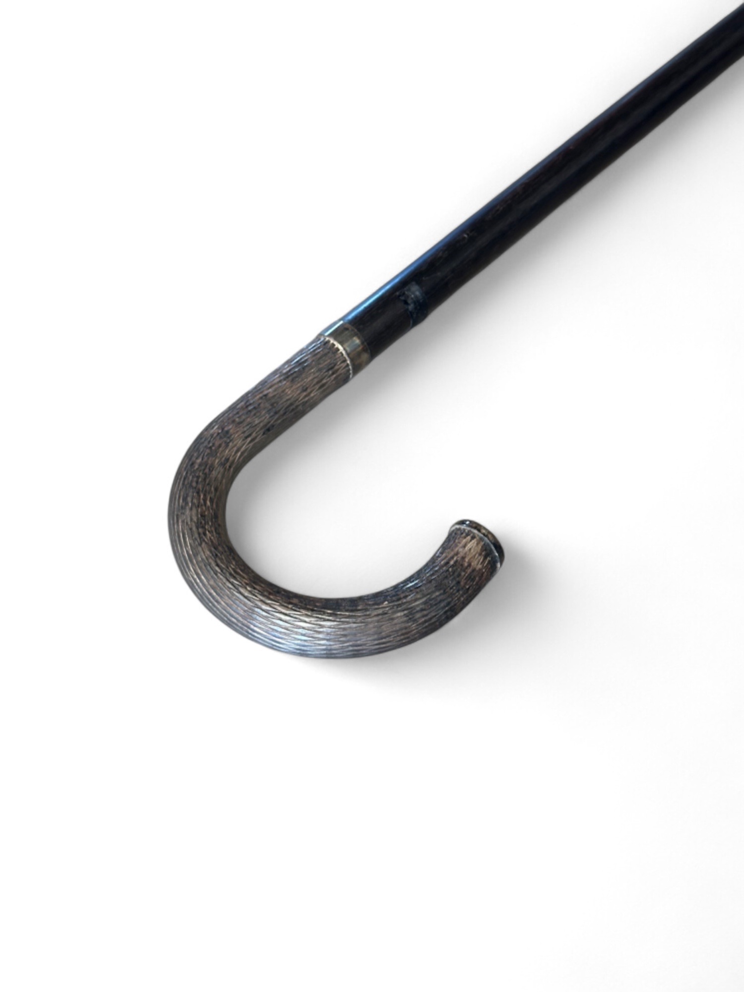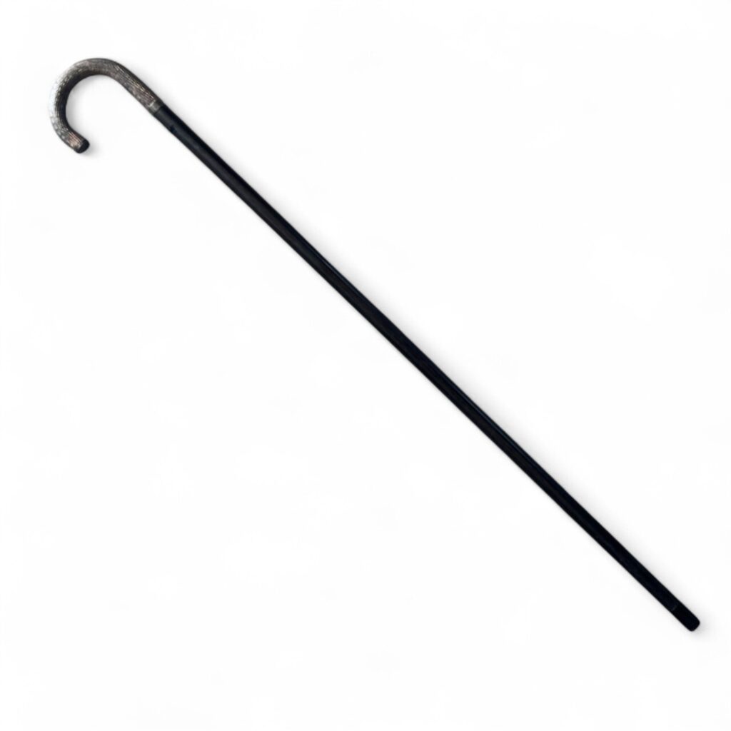 Elegant black walking cane with a curved silver-plated handle. Measures 4.5″W x 1″D x 39.25″H.